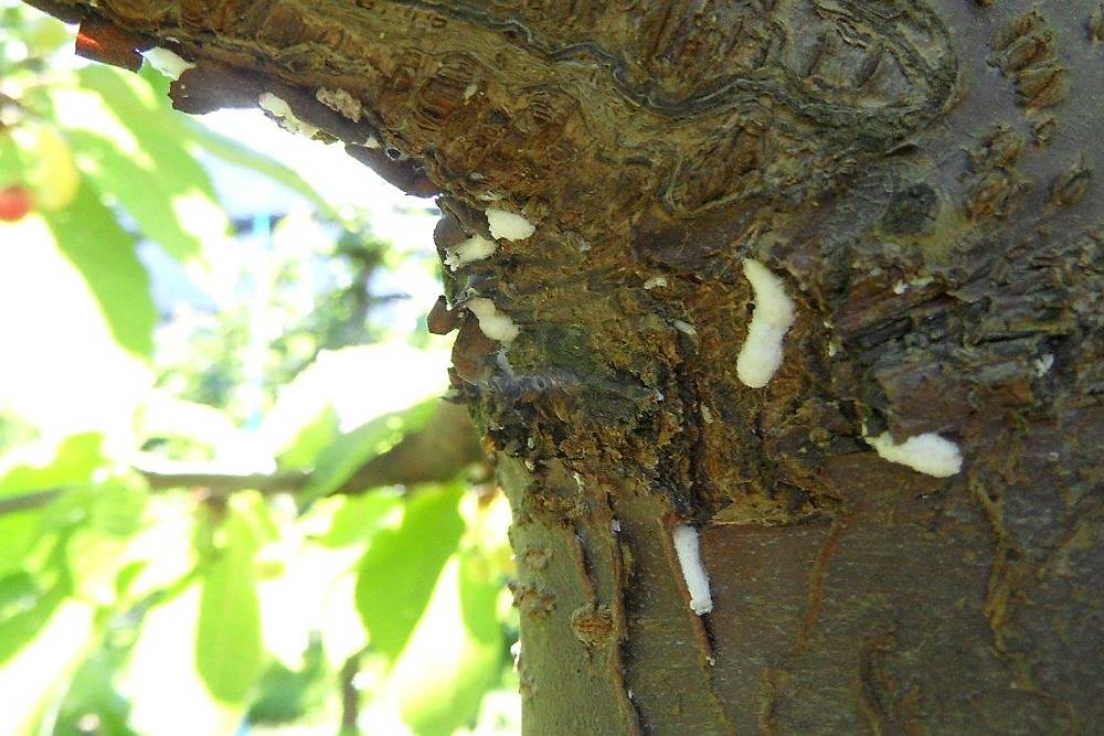 Eggsekker av epleullskjoldlus på epletre (Foto: M. Bøthun, NLR)