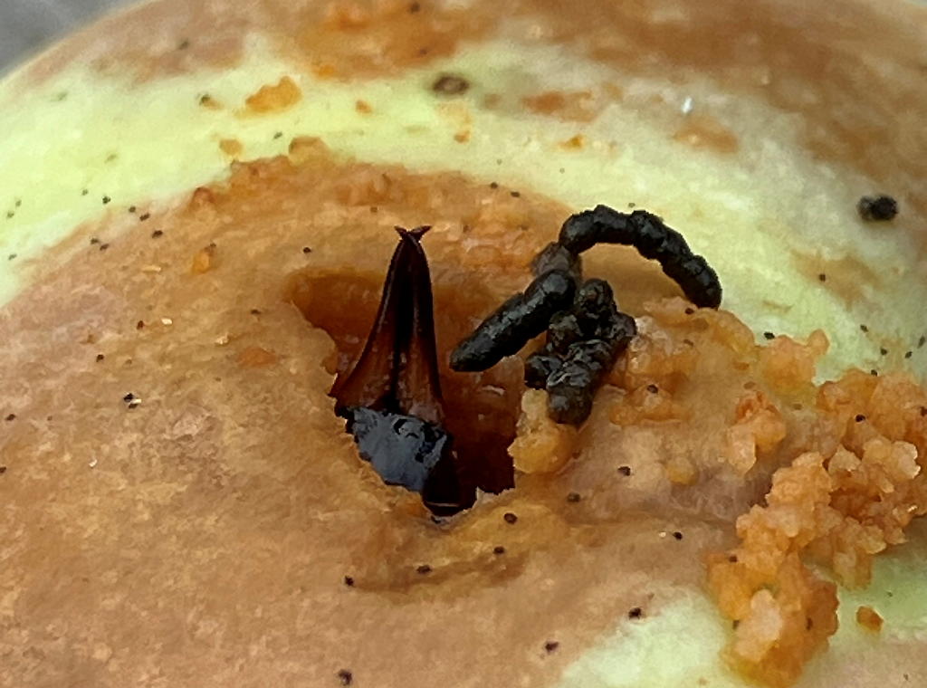 Saksedyrhunn som har gravd seg inn i et råttent eple, bildet viser også ekskrementene (Foto: N. Trandem, NIBIO)