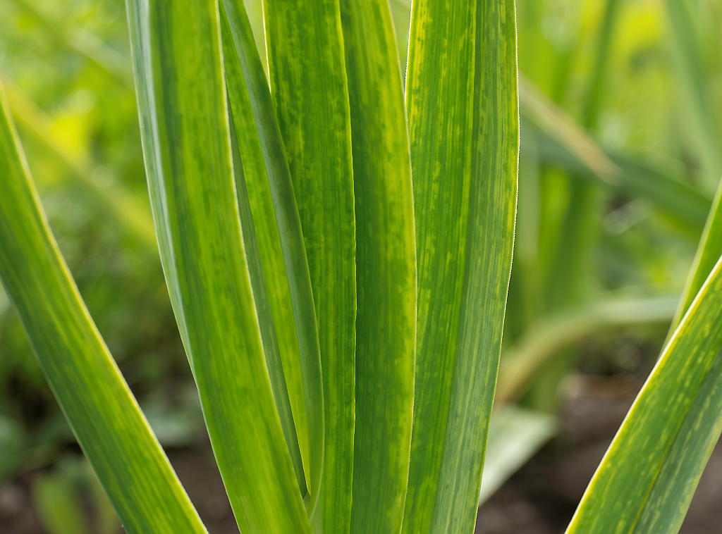 Hvitløk infisert med carlavirus har tydelige virussymptomer i form av gule, uregelmessige striper, selv om ikke løkgulmosaikkvirus er til stede. (Foto: D.-R. Blystad / NIBIO)