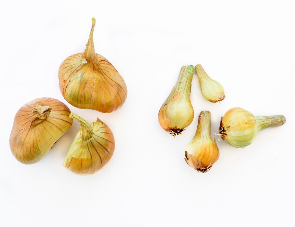 Avlingen av sjalottløk fra virusfrie planter (til venstre) er tydelig større enn når plantene er virusinfisert (til høyre), infisert av både løkgulmosaikkvirus og sjalottlatentvirus. (Foto: D.-R. Blystad / NIBIO)
