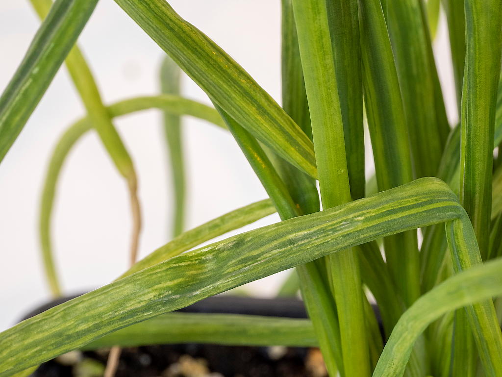 Løkgulmosaikkvirus sammen med sjalottlatentvirus gir tydelige gule, uregelmessige striper i bladene på infiserte planter av sjalottløk. (Foto: D.-R. Blystad / NIBIO)