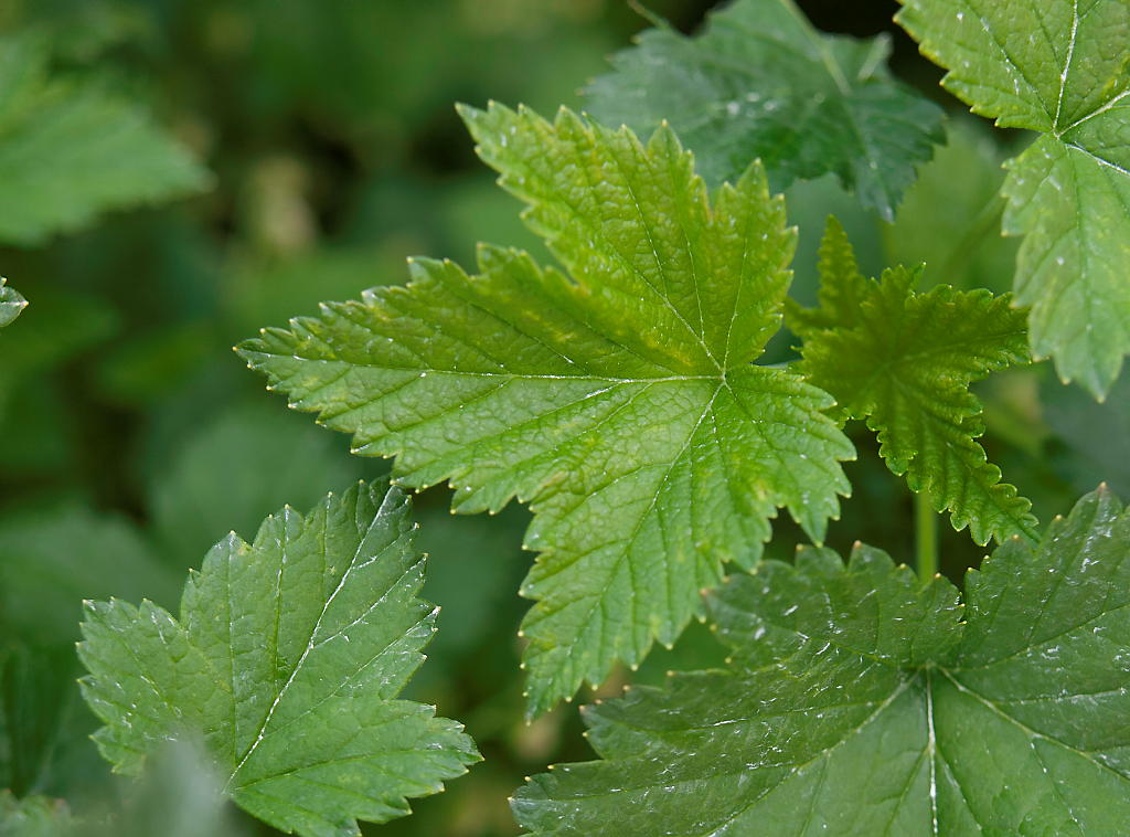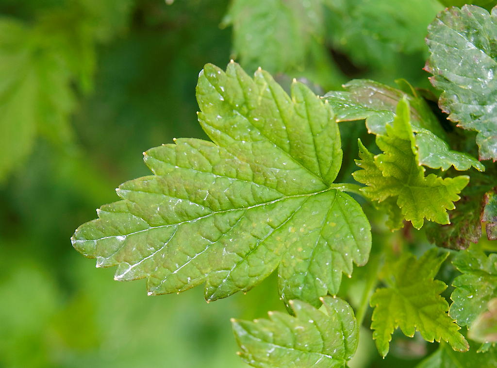 Solbærblad med redusert antall bladfliker og redusert tanning på bladkanten typiske symptomer på nesletopp. (Foto: Dag-Ragnar Blystad, NIBIO)