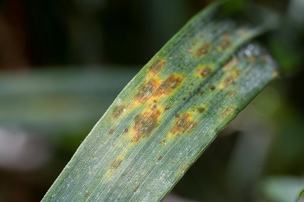 Hveteblad infisert med Microdochium spp. (sees som brune flekker med et avbleket område i midten av flekken). (Foto: E. Fløistad, NIBIO)