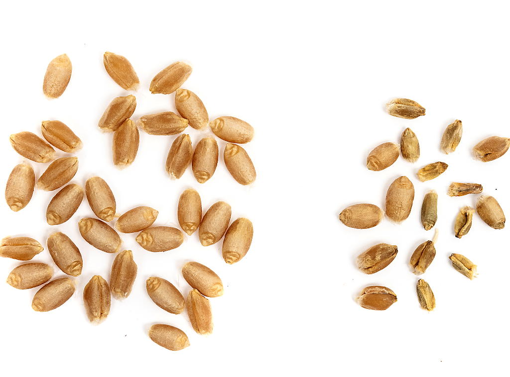 Skrumpne korn høsta fra hveteplanter smitta med Microdochium majus (til høyre) sammenliknet med korn fra usmitta planter (til venstre). (Foto: E. Fløistad, NIBIO)